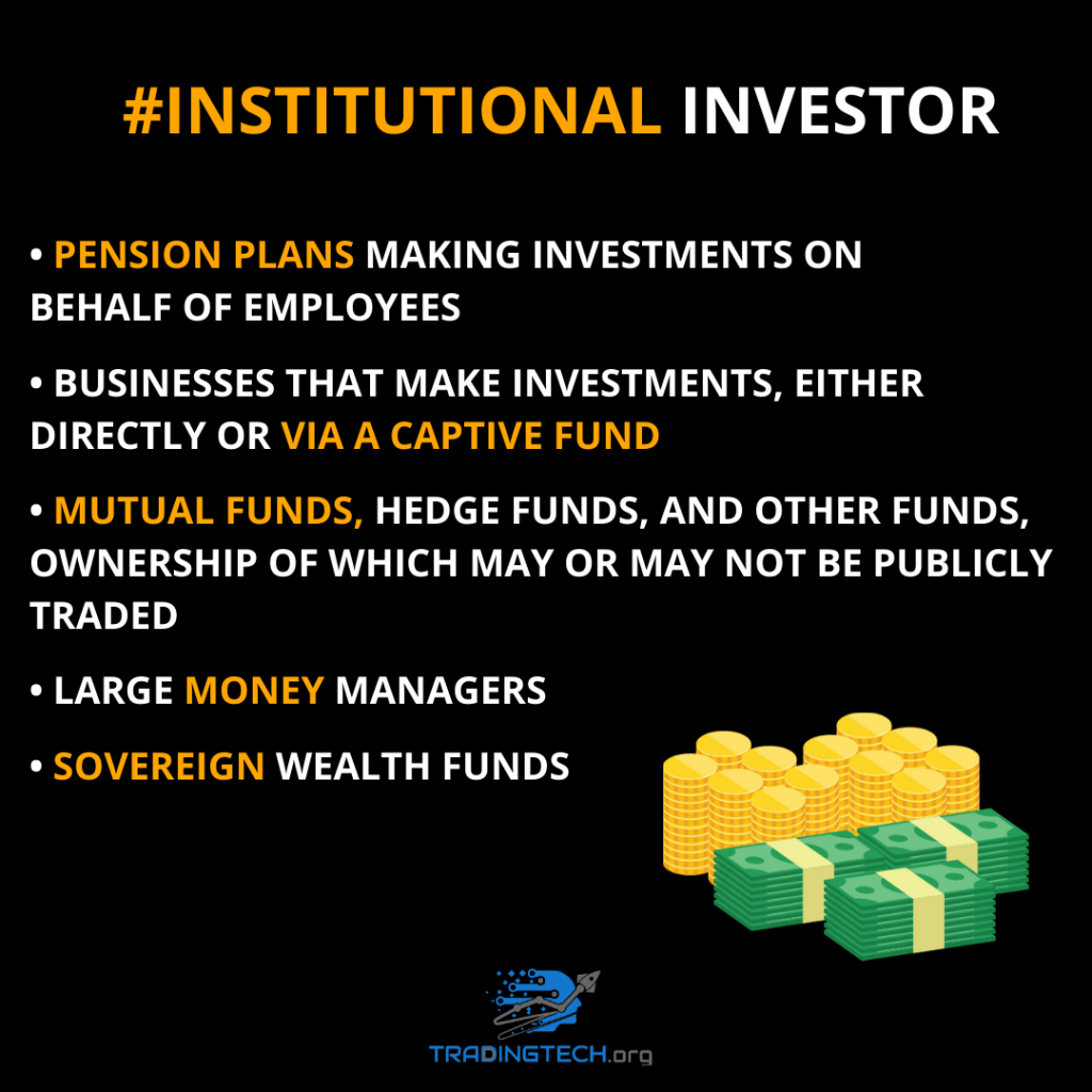 Figure: The infographic provides a detailed overview of an "Institutional Investor." It lists various entities that fall under this category, including pension plans that make investments on behalf of employees, businesses that invest either directly or through a captive fund, mutual funds, hedge funds, and other funds (which may or may not be publicly traded), large money managers, and sovereign wealth funds.