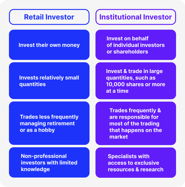 • Retail investors invest their own money, often in smaller amounts and less frequently.