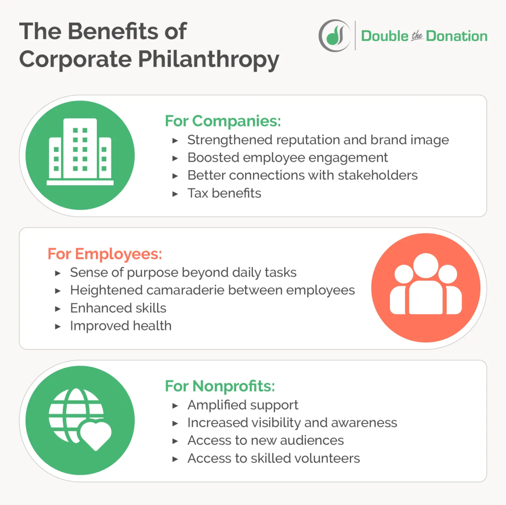 This figure highlights the multiple benefits that corporate philanthropy provides to three key groups: companies, employees، و nonprofits. For companies, philanthropy enhances reputation, employee engagement, and stakeholder relations while offering tax benefits. Employees gain a sense of purpose, improved camaraderie, enhanced skills, and health benefits. Nonprofits receive amplified support, increased visibility, and access to skilled volunteers and new audiences.