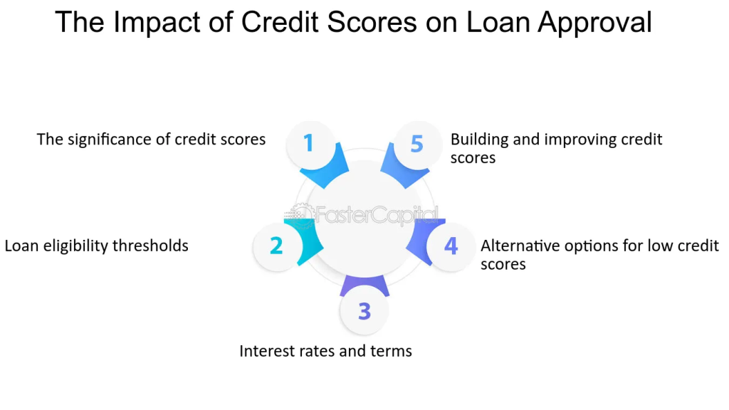 This figure explains the key areas where credit scores influence loan approval. It highlights five main factors: the significance of credit scores, loan eligibility thresholds, the impact on interest rates and terms, alternative options for low credit scores، و importance of building and improving credit scores. Each factor plays a crucial role in determining whether an individual is approved for a loan and the conditions of the loan.