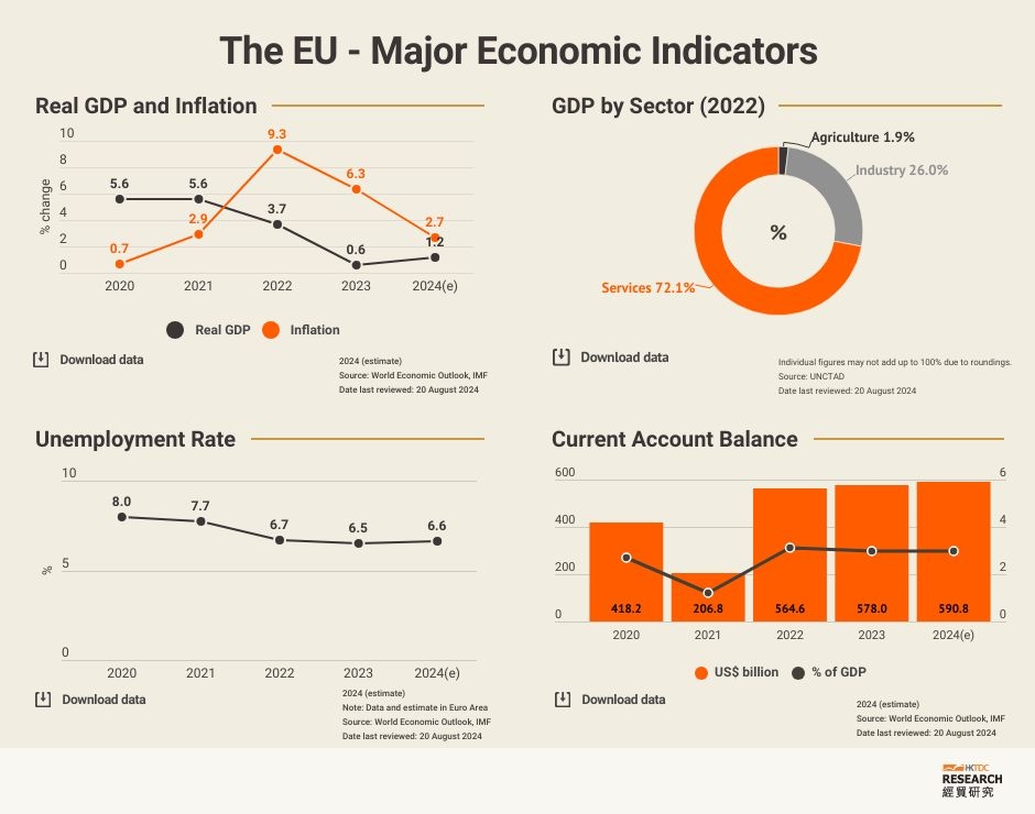 This image presents major economic indicators for the European Union from 2020 to 2024. It includes real GDP and inflation rates, GDP distribution by sector, unemployment rate, and current account balance. The GDP distribution for 2022 shows that services constitute 72.1%, while industry and agriculture make up 26.0% and 1.9%, respectively. The unemployment rate trends downward from 8.0% in 2020 to an estimated 6.6% in 2024, while current account balance fluctuates, peaking at 590.8 billion USD in 2024.