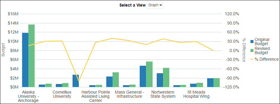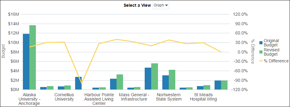 This graph compares the original budget Und revised budget for various institutions, with a line showing the percentage difference between them. The vertical bars represent budget values, while the line indicates how much the revised budget has changed from the original. Institutions such as Alaska University – Anchorage have significant budget revisions, while others like St Meads Hospital Wing show less variance.