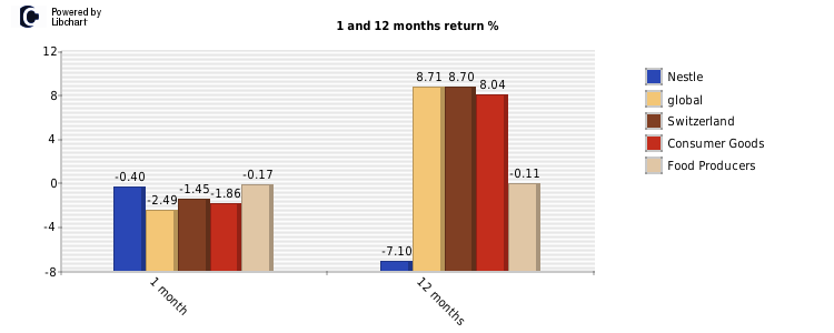 The chart displays the 1-month and 12-month return percentages for Nestlé in comparison with global markets, Switzerland, consumer goods, and food producers. In the 1-month period, Nestlé had a return of -0.40%, while other sectors experienced negative returns as well, with the global market at -2.49%, Switzerland at -1.45%, consumer goods at -1.86%, and food producers at 0.17%. For the 12-month period, Nestlé showed a return of -7.10%, whereas global, Switzerland, consumer goods, and food producers recorded 8.71%, 8.70%, 8.04%, Und -0.11%, respectively.