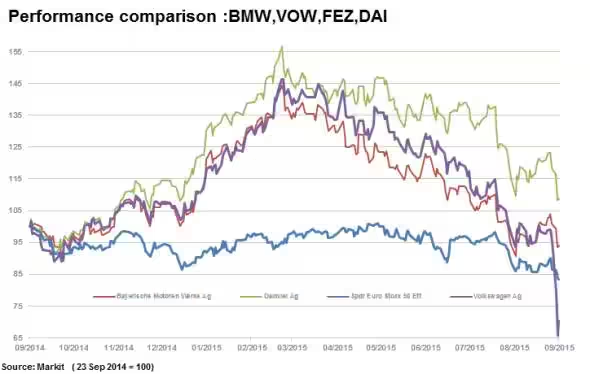 This line graph compares the performance of BMW (Bayerische Motoren Werke AG), Daimler AG, iShares Euro Stoxx 50 ETF (FEZ), Und Volkswagen AG over time, starting from September 2014. The chart uses an index base of 100 as of September 23, 2014, allowing viewers to observe relative changes in stock prices. The data shows notable fluctuations, particularly in 2015, where Volkswagen’s stock experienced a sharp decline, reflecting the company’s significant challenges during that period.