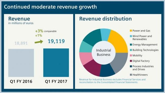 - Siemens achieved moderate revenue growth, with a 3% increase in comparable terms from Q1 FY 2016 to Q1 FY 2017.