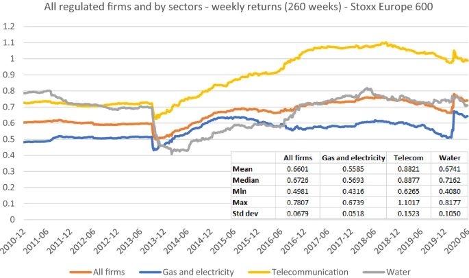 This line graph shows the weekly returns of regulated firms across different sectors within the Stoxx Europe 600 index over a period from 2010 to mid-2020. The sectors include Gas and Electricity, Telecommunication, Und Water, compared against the returns of All Firms within the index. The chart tracks mean, median, minimum, maximum, and standard deviation of returns. Notable fluctuations and differences in performance are visible among the sectors, with Telecommunication experiencing higher returns compared to other sectors, while Water remains relatively stable with the lowest volatility.