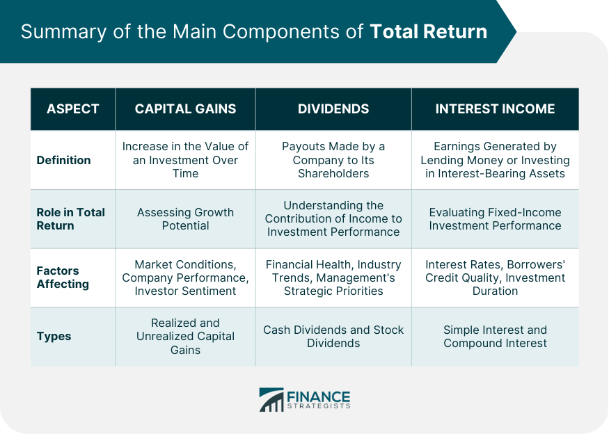 The figure outlines three main components of total return: Capital Gains, Dividends, and Interest Income. It explains how each component contributes to overall investment returns, including definitions, roles in total return, factors affecting them, and different types. For instance, capital gains focus on growth potential, dividends represent income from ownership, and interest income derives from fixed-income investments.