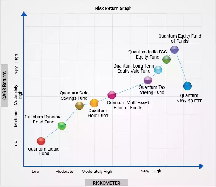 The figure displays a risk-return graph that categorizes various investment funds based on their risk level (x-axis) and their compound annual growth rate (CAGR) returns (y-axis). The graph shows different types of Quantum funds ranging from low-risk, low-return funds like the Quantum Liquid Fund to high-risk, high-return funds such as the Quantum Equity Fund of Funds. This helps illustrate how different investments can be compared in terms of the balance between risk and return.