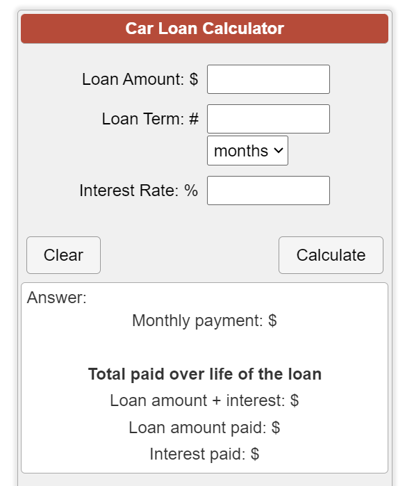 Η ιστοσελίδα διαθέτει μια αριθμομηχανή δανείου αυτοκινήτου, ένα εργαλείο που έχει σχεδιαστεί για να βοηθά τους χρήστες να υπολογίζουν τις μηνιαίες πληρωμές δανείου αυτοκινήτου. Εισαγάγοντας λεπτομέρειες όπως το ποσό του δανείου, το επιτόκιο, τη διάρκεια του δανείου και την προκαταβολή, οι χρήστες μπορούν να υπολογίσουν το μηνιαίο ποσό πληρωμής. Η αριθμομηχανή παρέχει επίσης ανάλυση των συνολικών τόκων που καταβλήθηκαν κατά τη διάρκεια της ζωής του δανείου και του συνολικού κόστους του αυτοκινήτου. Αυτό το εργαλείο βοηθά τους πιθανούς αγοραστές αυτοκινήτων να κατανοήσουν τις οικονομικές τους δεσμεύσεις και να σχεδιάσουν ανάλογα τους προϋπολογισμούς τους.