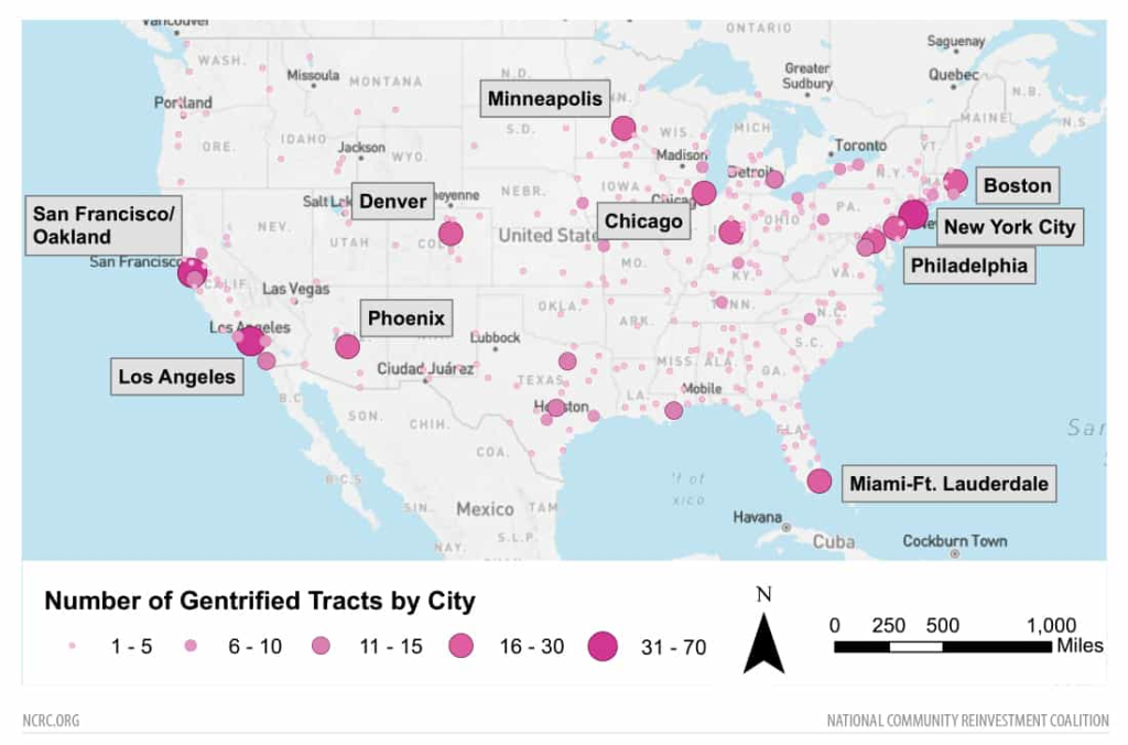 This map highlights the extent of gentrification across U.S. cities, with data showing the number of gentrified tracts per city. Cities are marked with pink circles, where the size of the circle corresponds to the number of gentrified tracts. Major cities such as New York City, San Francisco/Oakland, Los Angeles, Boston, and Miami-Ft. Lauderdale show the highest levels of gentrification (31–70 tracts), while smaller cities like Denver, Phoenix, and Minneapolis exhibit moderate levels (6–30 tracts). The data provides insight into urban areas experiencing significant socioeconomic and demographic shifts.