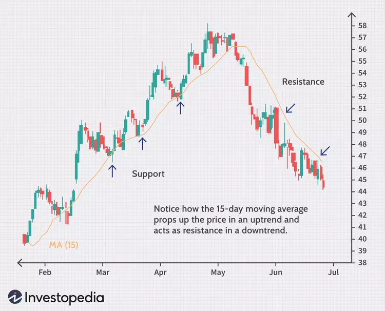 This chart illustrates how a 15-day moving average acts as both υποστήριξη και resistance in a stock’s price movement. In an uptrend, the moving average serves as a support level, meaning the stock price tends to bounce off the line as it rises. In a downtrend, the same moving average becomes a resistance level, preventing the stock price from moving higher. Arrows on the chart indicate where the moving average either supports or resists the price action.