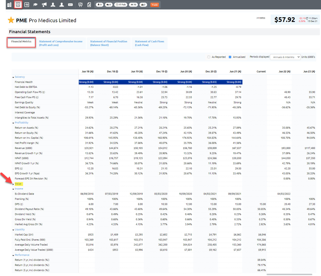 The image displays the financial metrics table for PME Pro Medicus Limited, highlighting various performance indicators over several reporting periods, including annual and semi-annual data. Metrics include key financial ratios, profitability, returns, and earnings metrics. The table is segmented into sections like financial health, profitability, return on assets/equity, EPS growth, dividend payout ratio, and more, helping users assess the company’s financial performance over time. A red arrow points to the revenue section, emphasizing its importance in evaluating business growth.