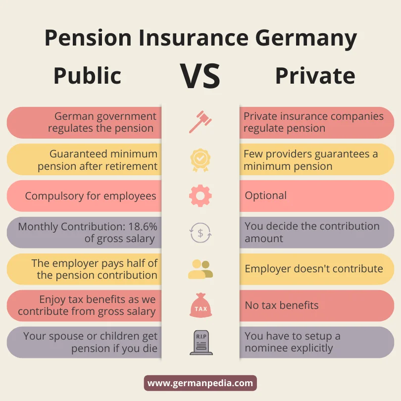 - Public pensions are mandatory for employees and managed by the government, ensuring a guaranteed minimum pension.