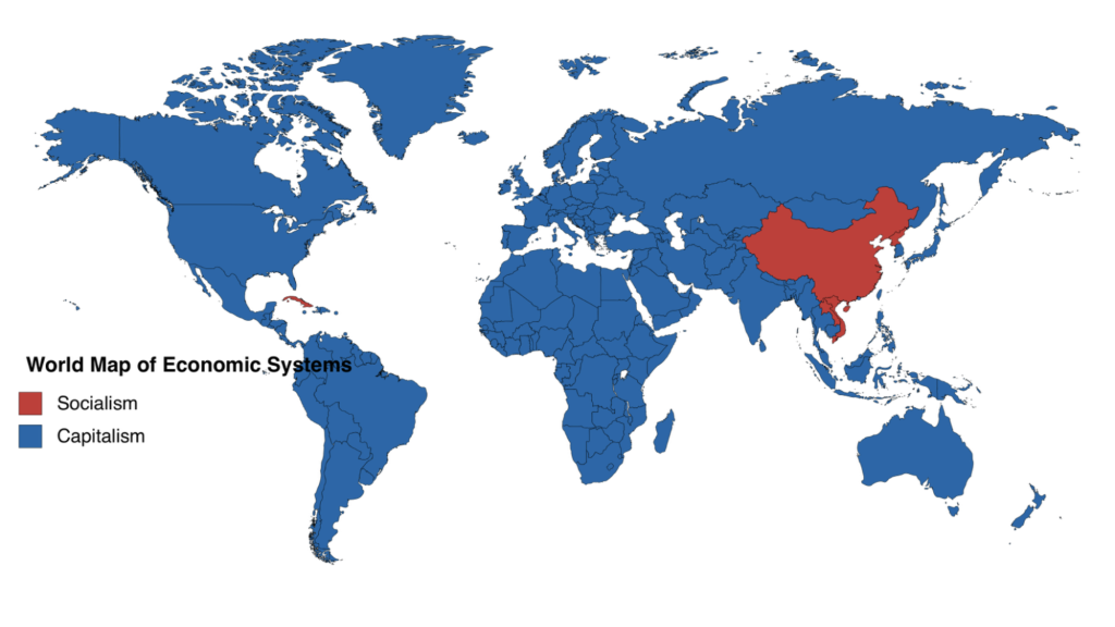 The figure is a world map highlighting the dominant economic systems across different countries. Countries marked in blue represent those following a capitalist economic system, where private ownership and free markets dominate. The countries shaded in red represent socialist systems, where the government has greater control over the economy. The map visually indicates that the majority of the world follows capitalist systems, with fewer nations practicing socialism.
