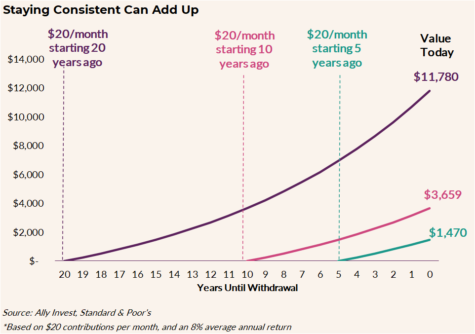 This graph demonstrates the power of consistent investing over different time periods. It shows the growth of a $20 monthly investment over 5, 10, and 20 years, assuming an 8% average annual return. The results reveal that starting earlier results in significantly higher returns, with a 20-year contribution growing to $11,780, a 10-year contribution reaching $3,659, and a 5-year contribution totaling $1,470. The graph emphasizes the impact of time in the market.