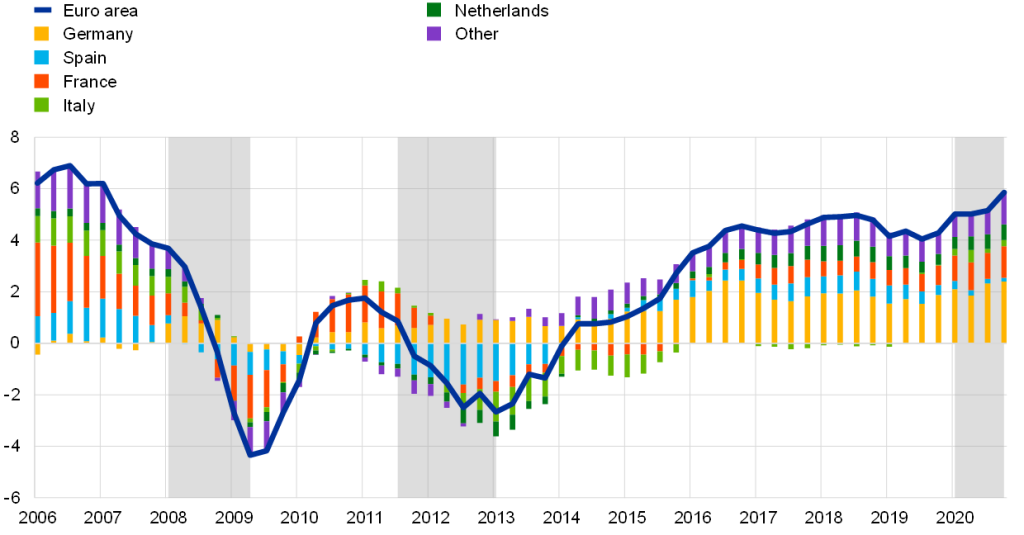 This figure shows the components contributing to GDP growth in the Euro Area over time, with a focus on individual sectors such as consumption, investment, exports, imports, and government expenditure. The bars represent the contributions of each sector, while the blue line indicates the overall GDP growth. Shaded areas represent periods of economic recessions. By analyzing the chart, viewers can observe the fluctuations in GDP growth and identify how specific components influenced these trends during different time periods.