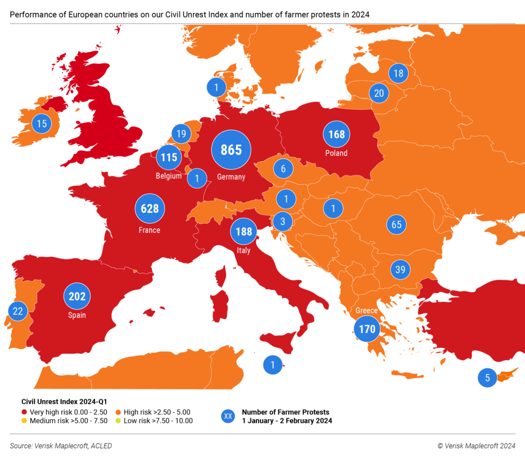 - Γερμανία, Γαλλία, και Ιταλία are experiencing high levels of farmer protests, correlating with high civil unrest risks.