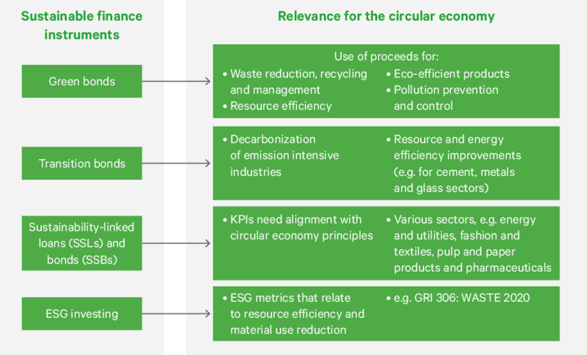 The figure outlines different sustainable finance instruments, such as green bonds, transition bonds, sustainability-linked loans, and ESG investing. It explains how each of these instruments contributes to the circular economy by promoting waste reduction, decarbonization, energy efficiency, and alignment with circular economy principles across various sectors.