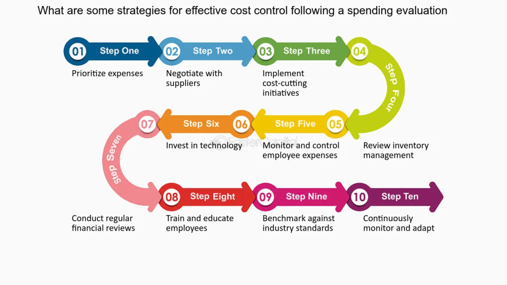 The image outlines a ten-step strategy for managing and controlling costs following a spending evaluation. Each step provides a clear and systematic approach, starting from prioritizing expenses and negotiating with suppliers, to investing in technology, conducting financial reviews, and continuously adapting strategies. It highlights a comprehensive cycle of actions designed to maintain financial health within an organization.
