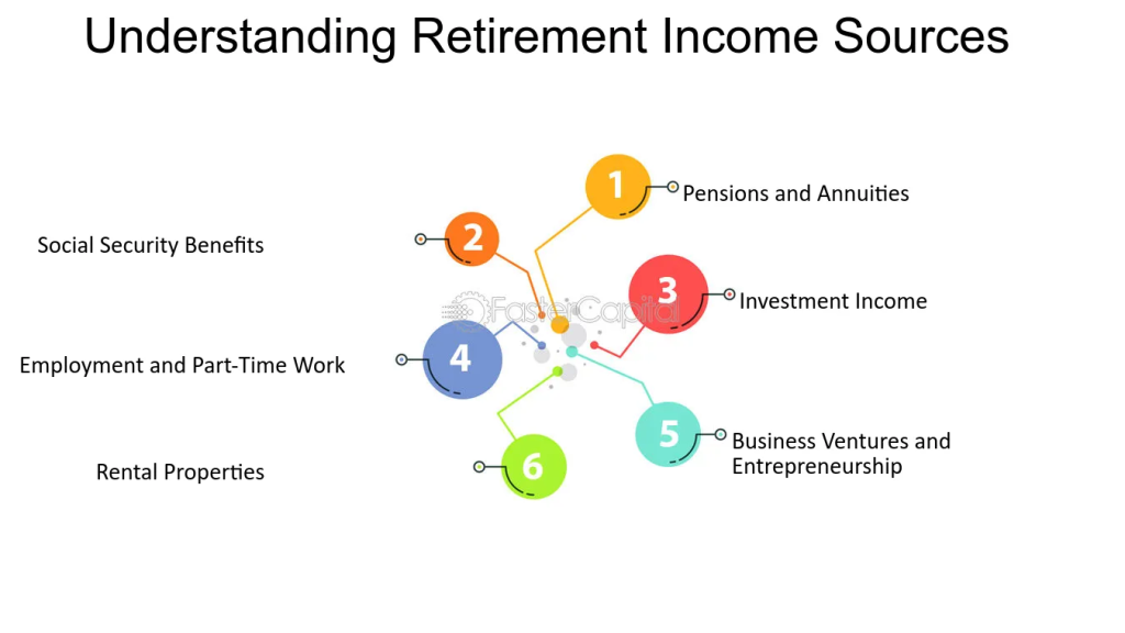 The figure outlines six main sources of retirement income: pensions and annuities, investment income, business ventures and entrepreneurship, social security benefits, employment and part-time work, and rental properties. It highlights how retirees can diversify their income streams by leveraging these different options, thus ensuring financial stability during retirement.