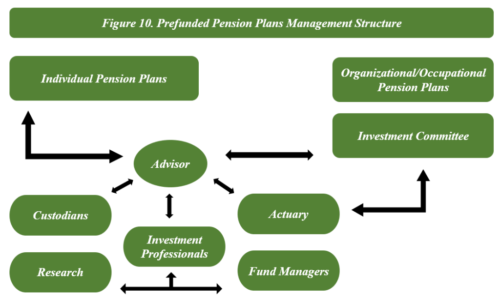 This figure illustrates the structure of prefunded pension plans, showing how different entities and professionals interact within the management of both individual and organizational pension plans. The central role is held by an Advisor, who collaborates with entities such as Custodians, Investment Professionals, Actuaries, και Fund Managers. The Investment Committee plays a crucial role in guiding investment decisions, while other stakeholders, such as Research teams, provide necessary data and insights.