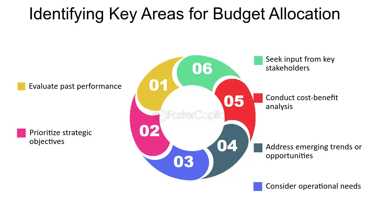 The figure outlines six key areas to focus on when allocating a budget: evaluating past performance, prioritizing strategic objectives, considering operational needs, addressing emerging trends or opportunities, conducting cost-benefit analysis, y seeking input from key stakeholders. Each element is presented as a section of a circular flow, emphasizing the continuous nature of effective budget allocation.