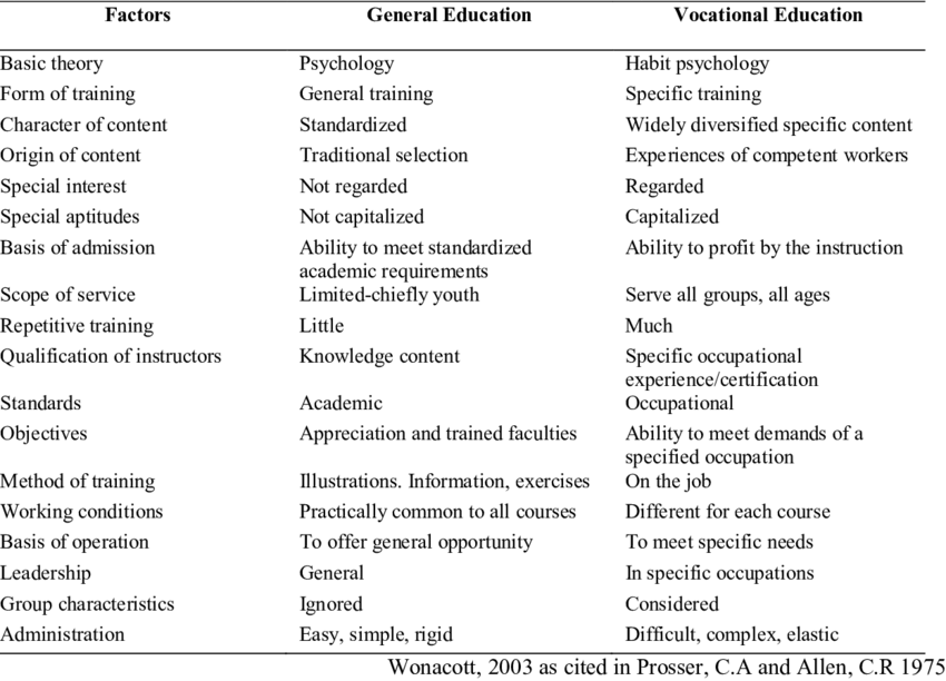 • Qualification of instructors differs: general education requires academic knowledge, whereas vocational education demands practical, job-specific experience.