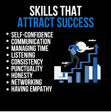 Figure: This infographic highlights "Skills That Attract Success," which include self-confidence, communication, time management, listening, consistency, punctuality, honesty, networking, and empathy. These soft skills are essential for personal and professional growth, helping individuals build strong relationships and achieve their goals. Advice: Focus on developing these skills through practice and self-awareness. Effective communication, time management, and networking, for example, can open doors to new opportunities and help you maintain a strong professional reputation.