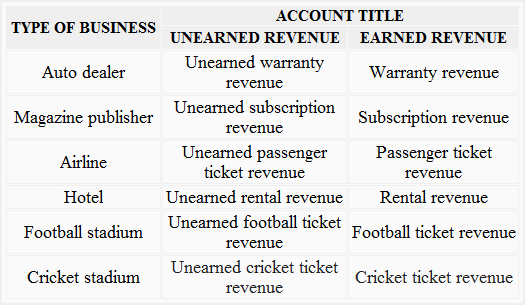 This table categorizes different types of businesses, such as auto dealers, airlines, and football stadiums, based on the distinction between unearned revenue et earned revenue. It highlights examples of unearned revenue (such as unearned subscription revenue for a magazine publisher) and their corresponding earned revenue once the service or product has been provided (e.g., subscription revenue after the service has been delivered). This comparison shows how businesses transition revenue from unearned to earned as services are rendered or goods are delivered.