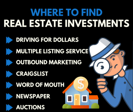Figura: Questa infografica presenta varie strategie per gli investimenti immobiliari, evidenziando metodi come "Driving for Dollars", utilizzando più servizi di quotazione, impegnandosi nel marketing in uscita, sfruttando piattaforme come Craigslist, facendo affidamento sul passaparola, facendo pubblicità sui giornali e partecipando ad aste . Ciascun metodo offre un approccio unico per identificare e garantire opportunità di investimento immobiliare. Queste informazioni sono preziose per gli investitori che cercano tattiche diverse per migliorare il proprio portafoglio di investimenti nel mercato immobiliare.