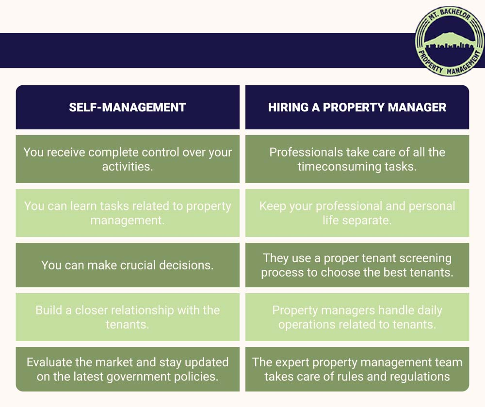 - Self-managing properties gives landlords more control and helps them learn about rental operations. However, it requires more time, effort, and understanding of local regulations, which can vary widely between cities and countries.