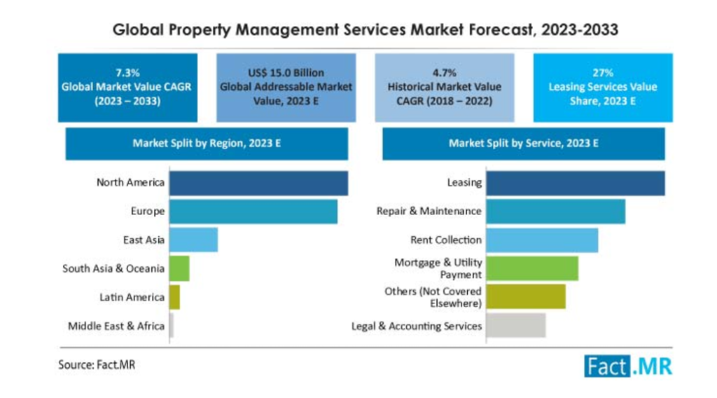- の global market for property management services is growing quickly, with a projected 7.3% annual growth from 2023 to 2033. Services like leasing, maintenance、 そして rent collection are in high demand, especially in North America and Europe.