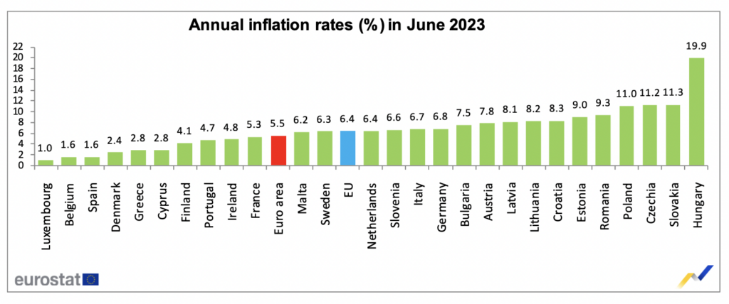 The bar chart illustrates the annual inflation rates across different European Union countries for June 2023. It shows how ინფლაცია varies significantly among these countries, with Hungary experiencing the highest rate at 19.9%, while Luxembourg has the lowest at 1.0%. The Euro area inflation rate stands at 5.5%, slightly below the EU average of 6.4%.