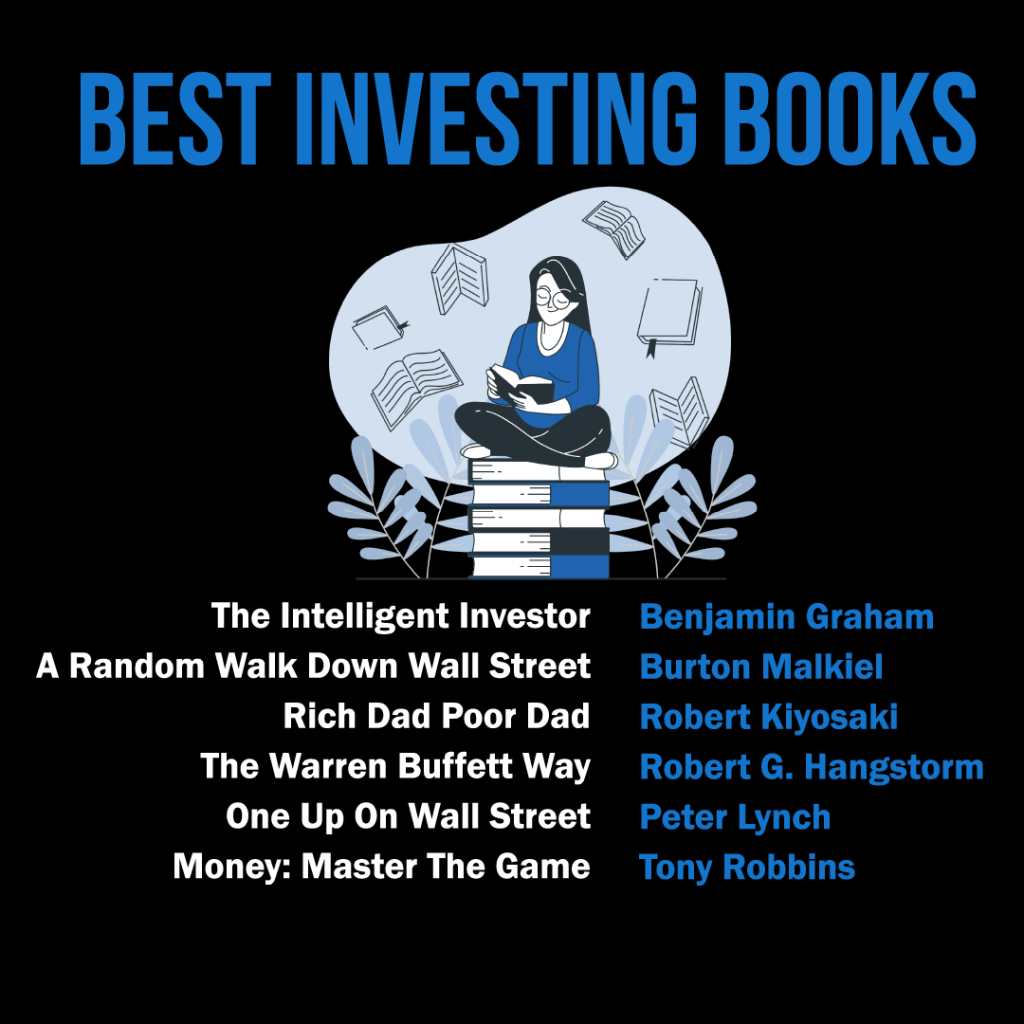 Figure: The infographic lists "Best Investing Books" that are considered must-reads for anyone interested in learning about investing. The books mentioned are: "The Intelligent Investor" by Benjamin Graham "A Random Walk Down Wall Street" by Burton Malkiel "Rich Dad Poor Dad" by Robert Kiyosaki "The Warren Buffett Way" by Robert G. Hagstrom "One Up On Wall Street" by Peter Lynch "Money: Master The Game" by Tony Robbins These books cover a range of investment philosophies, from value investing to personal finance, and offer insights into the strategies of some of the world's most successful investors. For practical use, readers should consider starting with one book that aligns most closely with their investment style or goals and apply the principles learned to their own investment strategies. Source: Custom Infographic