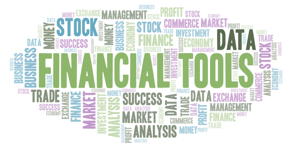 Figure: A vibrant word cloud illustration centered around financial tools.