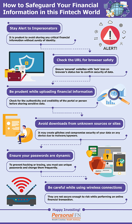 This infographic provides a list of essential security practices for protecting your sensitive financial information in the age of digital finance. It visually outlines key actions you can take, such as creating strong passwords and being aware of phishing scams. The overall purpose is to educate users on how to safely navigate the world of online banking and FinTech applications.