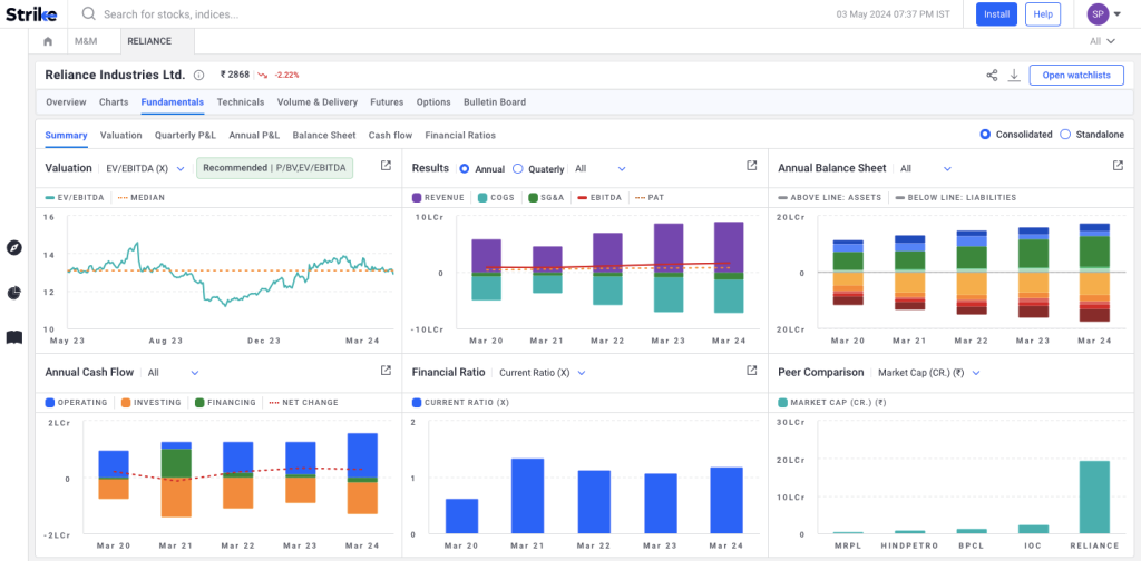 Investors can use this dashboard to conduct a thorough fundamental analysis of Reliance Industries Ltd., evaluating its financial health, profitability, e market competitiveness. This analysis helps users make informed decisions on whether to buy, hold, or sell the stock based on financial metrics, historical performance, and peer standing.