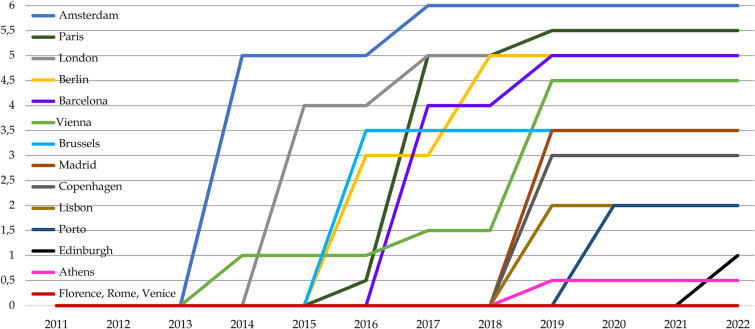 - Latecomers: Cities such as Athens, Porto, and Florence experienced slower initial growth, with marked increases post-2016.