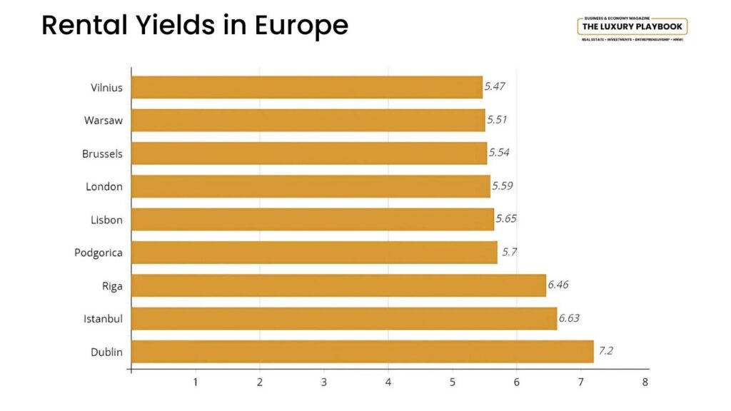 - Highest Yields: Dublin (7.2%) e Istanbul (6.63%) offer the most attractive rental yields in Europe, making them prime locations for rental property investments.